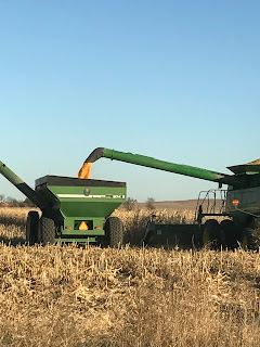 Now that beet harvest is FINALLY over, corn harvest is kicking into gear. While all harvest is somewhat stressful, corn harvest seems much more relaxed after the crazy hours of beet harvest. Beets can only be harvested in optimal temperature. If the weather is too hot or too cold, the piler where the beets are collected shuts down. Corn, though, can be picked in most temperatures as long as the crop is dry and the ground isn't too muddy.